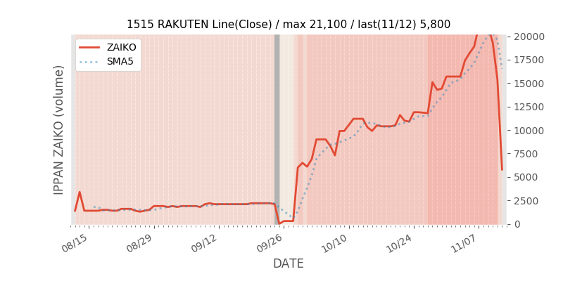 高値付近にある指値注文の合計株数です。一見在庫は無いのにキープの注文だけ行われクロス実行されないまま終わる注文は多数あり、その株数がどのくらいか?を推定する手がかりです。当然株数の全てが一般売りとは限りませんが、在庫数だけでは実態が見えない現状への対策です。
