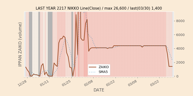 高値付近にある指値注文の合計株数です。一見在庫は無いのにキープの注文だけ行われクロス実行されないまま終わる注文は多数あり、その株数がどのくらいか?を推定する手がかりです。当然株数の全てが一般売りとは限りませんが、在庫数だけでは実態が見えない現状への対策です。