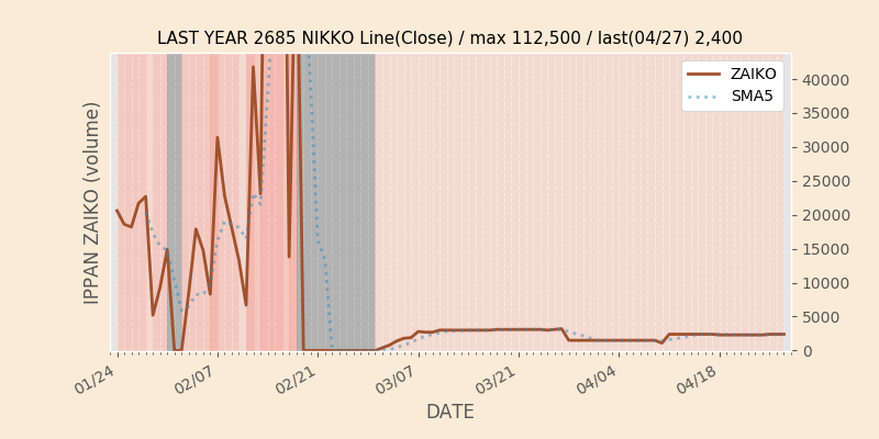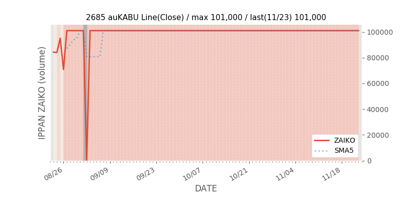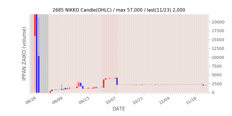権利落ち日になると在庫が急回復します。どれだけの在庫が供給されたかを類推できます。もちろん、権利付最終日以前に大量補充された例も目立ちますから、過去チャートをご覧になる際は日付にご注意ください。