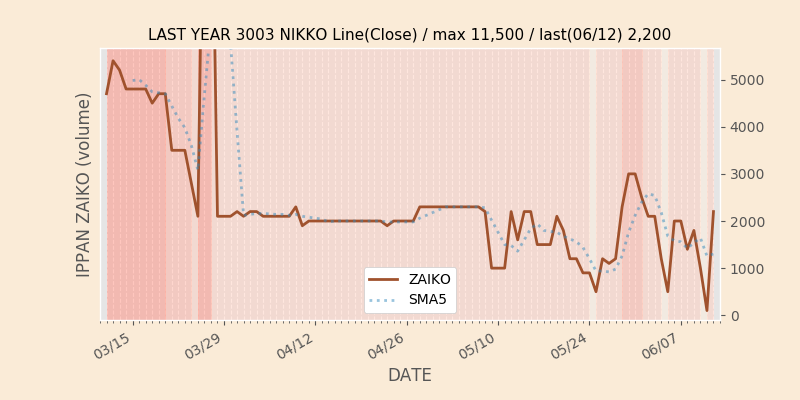 権利落ち日になると在庫が急回復します。どれだけの在庫が供給されたかを類推できます。もちろん、権利付最終日以前に大量補充された例も目立ちますから、過去チャートをご覧になる際は日付にご注意ください。