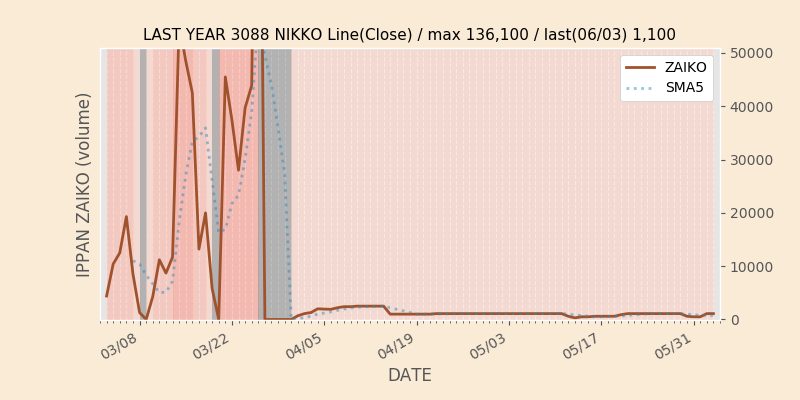 権利落ち日になると在庫が急回復します。どれだけの在庫が供給されたかを類推できます。もちろん、権利付最終日以前に大量補充された例も目立ちますから、過去チャートをご覧になる際は日付にご注意ください。