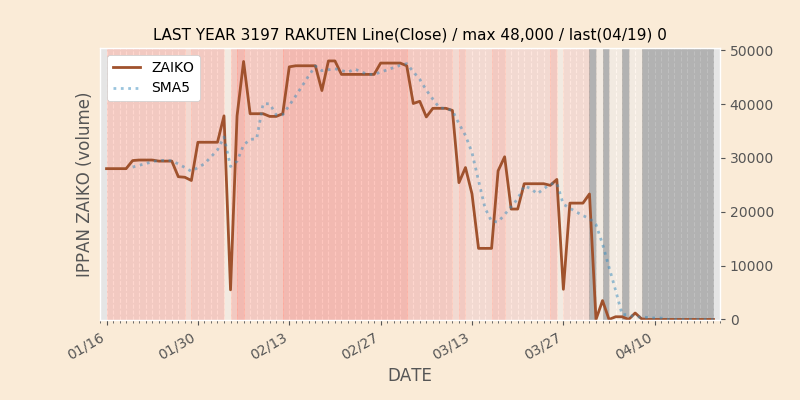 権利落ち日になると在庫が急回復します。どれだけの在庫が供給されたかを類推できます。もちろん、権利付最終日以前に大量補充された例も目立ちますから、過去チャートをご覧になる際は日付にご注意ください。