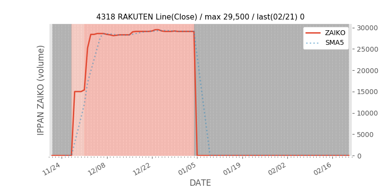 高値付近にある指値注文の合計株数です。一見在庫は無いのにキープの注文だけ行われクロス実行されないまま終わる注文は多数あり、その株数がどのくらいか?を推定する手がかりです。当然株数の全てが一般売りとは限りませんが、在庫数だけでは実態が見えない現状への対策です。
