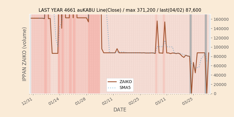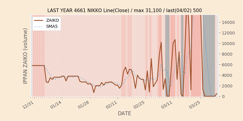 権利落ち日になると在庫が急回復します。どれだけの在庫が供給されたかを類推できます。もちろん、権利付最終日以前に大量補充された例も目立ちますから、過去チャートをご覧になる際は日付にご注意ください。