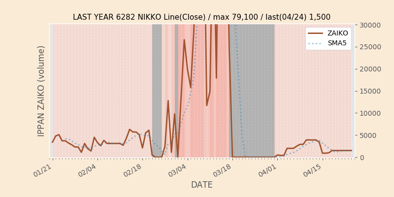 高値付近にある指値注文の合計株数です。一見在庫は無いのにキープの注文だけ行われクロス実行されないまま終わる注文は多数あり、その株数がどのくらいか?を推定する手がかりです。当然株数の全てが一般売りとは限りませんが、在庫数だけでは実態が見えない現状への対策です。