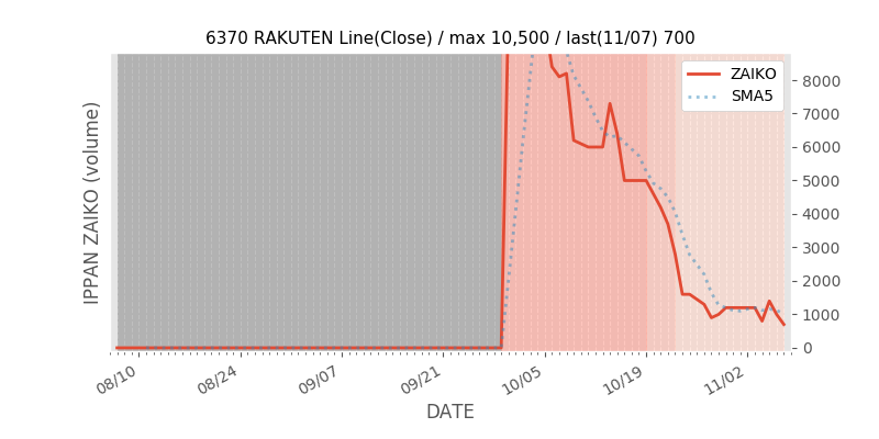 高値付近にある指値注文の合計株数です。一見在庫は無いのにキープの注文だけ行われクロス実行されないまま終わる注文は多数あり、その株数がどのくらいか?を推定する手がかりです。当然株数の全てが一般売りとは限りませんが、在庫数だけでは実態が見えない現状への対策です。