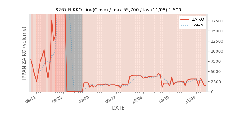 権利落ち日になると在庫が急回復します。どれだけの在庫が供給されたかを類推できます。もちろん、権利付最終日以前に大量補充された例も目立ちますから、過去チャートをご覧になる際は日付にご注意ください。
