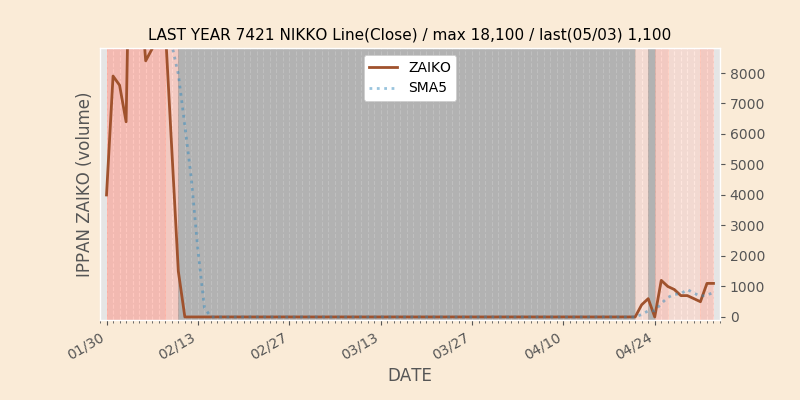 権利落ち日になると在庫が急回復します。どれだけの在庫が供給されたかを類推できます。もちろん、権利付最終日以前に大量補充された例も目立ちますから、過去チャートをご覧になる際は日付にご注意ください。