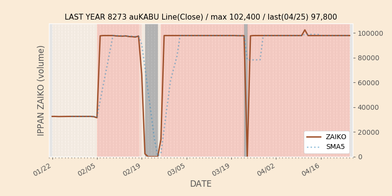 権利落ち日になると在庫が急回復します。どれだけの在庫が供給されたかを類推できます。もちろん、権利付最終日以前に大量補充された例も目立ちますから、過去チャートをご覧になる際は日付にご注意ください。