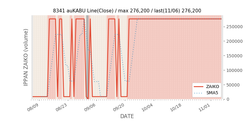 権利落ち日になると在庫が急回復します。どれだけの在庫が供給されたかを類推できます。もちろん、権利付最終日以前に大量補充された例も目立ちますから、過去チャートをご覧になる際は日付にご注意ください。