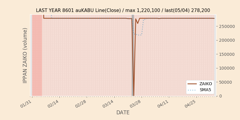 権利落ち日になると在庫が急回復します。どれだけの在庫が供給されたかを類推できます。もちろん、権利付最終日以前に大量補充された例も目立ちますから、過去チャートをご覧になる際は日付にご注意ください。