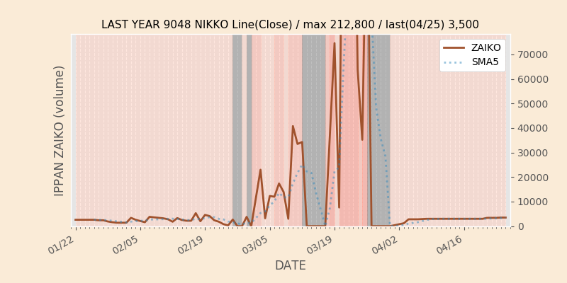 権利落ち日になると在庫が急回復します。どれだけの在庫が供給されたかを類推できます。もちろん、権利付最終日以前に大量補充された例も目立ちますから、過去チャートをご覧になる際は日付にご注意ください。
