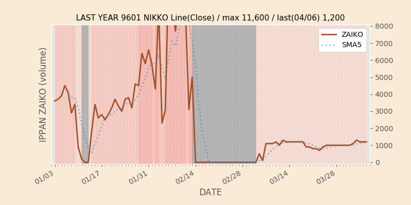 権利落ち日になると在庫が急回復します。どれだけの在庫が供給されたかを類推できます。もちろん、権利付最終日以前に大量補充された例も目立ちますから、過去チャートをご覧になる際は日付にご注意ください。