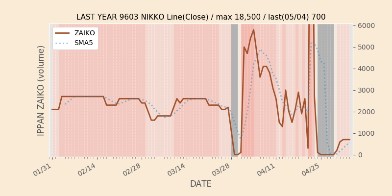 権利落ち日になると在庫が急回復します。どれだけの在庫が供給されたかを類推できます。もちろん、権利付最終日以前に大量補充された例も目立ちますから、過去チャートをご覧になる際は日付にご注意ください。